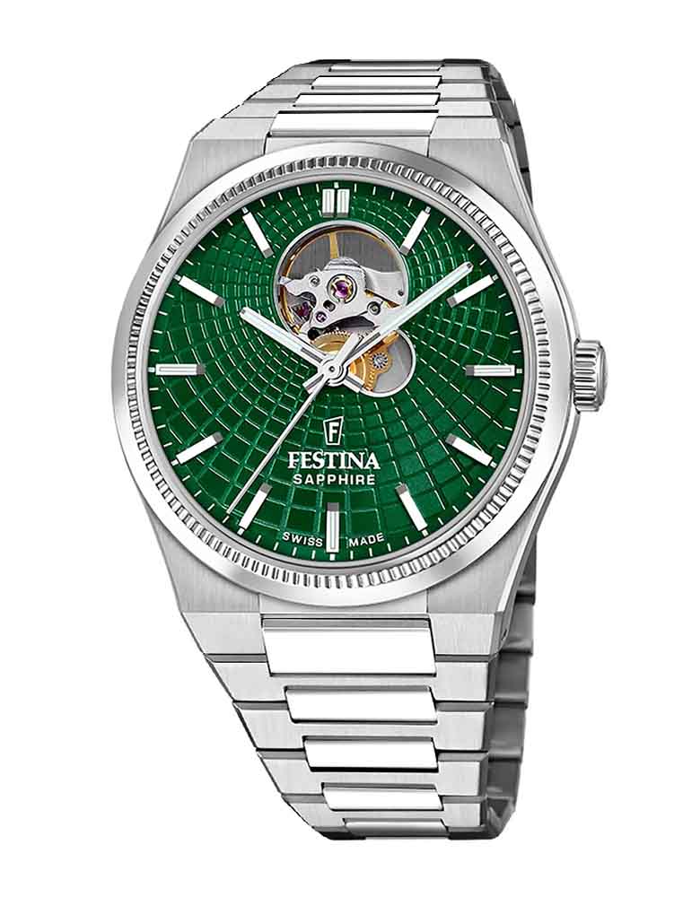 Ένα αυτόματο ρολόι της Festina από τη σειρά Automatic με ατσάλινη ανοξείδωτη κάσα 40mm και ατσάλινο μπρασελέ. Το καντράν είναι ανοιχτό στη θέση 12 για να φαίνεται η λειτουργία του μηχανισμού και έχει κρύσταλλο από αχάρακτο ζαφείρι.