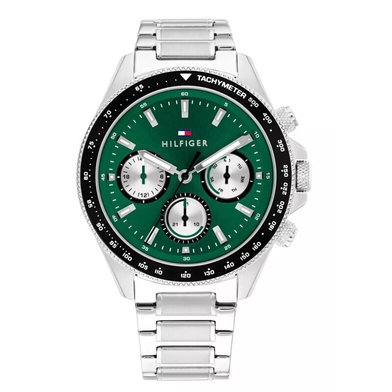 Ανδρικό ρολόι Tommy Hilfiger κατασκευασμένο από ανοξείδωτο ατσάλι. Διαθέτει πράσινο καντράν και μπρασελέ.