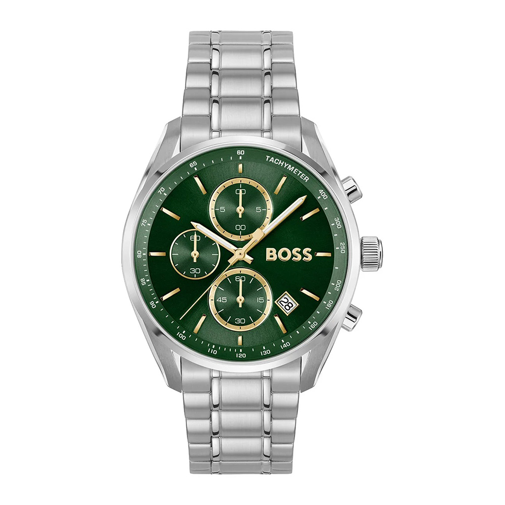 Το BOSS 1514265 είναι ένα κομψό ανδρικό ρολόι που συνδυάζει λειτουργικότητα και στυλ. Διαθέτει πράσινο καντράν με ένδειξη ημερομηνίας, χρονογράφο και κομψούς χρυσούς δείκτες.
