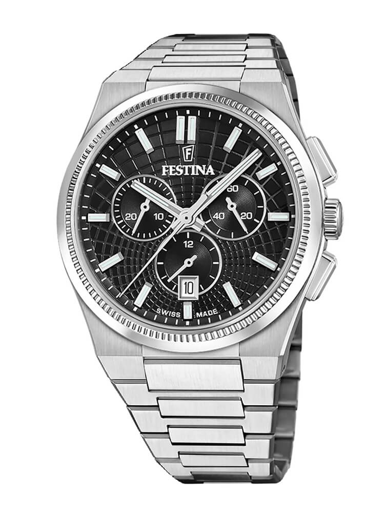 Ένα ρολόι της Festina από τη σειρά Swiss Made Gent με ατσάλινη κάσα 43mm και ατσάλινο μπρασελέ. Το καντράν έχει pattern, μεταλλικές λεπτομέρειες και δείχτες. Το κρύσταλλο του είναι από αχάρακτο ζαφείρι και ο μηχανισμός του διαθέτει: